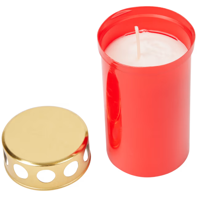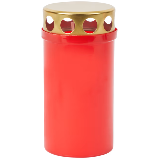 Een kleine herdenkingskaars in rood kunststof, om een dierbare te herdenken.